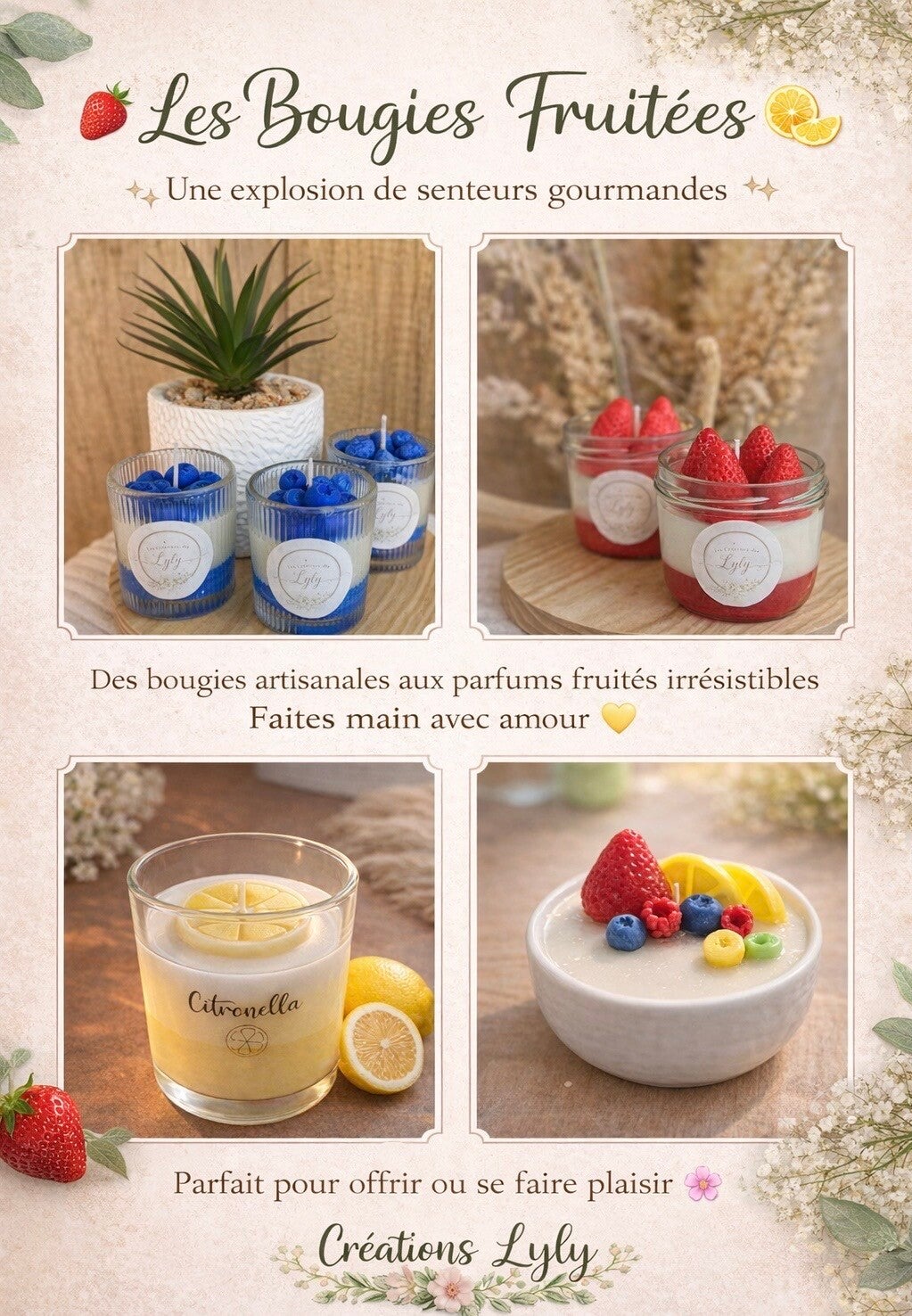 Chez Les Créations de Lyly, nous aimons organiser nos trésors parfumés par thèmes évocateurs. Que vous recherchiez une ambiance festive, une escapade saisonnière ou une touche gourmande, nos collections sont pensées pour vous aider à trouver la bougie parfaite. Laissez-vous guider par votre cœur et découvrez des senteurs qui racontent des histoires.